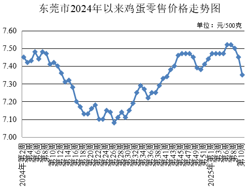 第10周,所監(jiān)測的雞蛋農(nóng)貿(mào)市場零售均價為每500克7.35元,較上周下降1.34%。